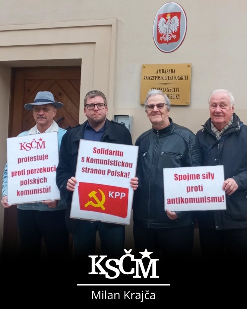 Před sídlem Velvyslanectví Polské republiky v Praze vyjádřili členové Komunistické strany Čech a Moravy rozhodný protest proti perzekuci Komunistické strany Polska. My, čeští komunisté, rezolutně odsuzujeme aktuální nepřijatelný čin prezidenta Polské republiky Karola Nawrockého, který podal návrh k Ústavnímu soudu vaší země, v němž tvrdí, že „cíle a aktivity Komunistické strany Polska jsou protiústavní.